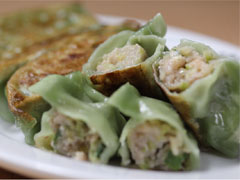 「わさビーフ」の濃厚な風味と辛味を、長野県産わさびで再現した焼き餃子。皮が緑色でわさびらしく、見るからにツンと来そう。加熱しても辛味は飛ばず、焼けた皮の香ばしさとともに味わえるそうです。