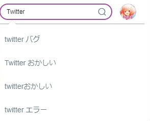 影響を受けている人が多いためか、Twitterで「Twitter」を検索しようとするとサジェストに「バグ」「おかしい」「エラー」などが表示される