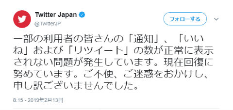 問題は通知、「いいね」「リツイート」の数が正しく表示されないというもの。同社は現在回復に努めているとコメントしています。