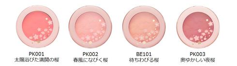 パールパウダーが上品なツヤを演出するチークパウダー。ほのかに上気した血色感を出してくれます。桜の花をかたどったデザインがかわいく、乙女心をくすぐります。色は華やかな桜カラー「太陽を浴びた満開の桜」や、深いピンク色「奥ゆかしい夜桜」といった、印象のちがう4色が発売されます。価格は各972円