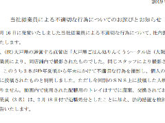 同社は、動画内で使用された配膳用のトレイは既に廃棄しており、当該従業員3人は18日付で退職処分としたと説明。今後は従業員向けの勉強会、携帯端末のバックヤード以外の店舗内への持ち込み禁止ルールの周知徹底など再発防止策を実行するとしています。