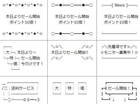 コンピュータの性能が低く、テキストしか使えない環境下では役に立ったといわれていますが、現在でも全く目にしないわけではありません。というのも、ビジネスメールの下部に記載されている社名などを入れた「署名」、メールマガジンの装飾などによく使われているんですね。