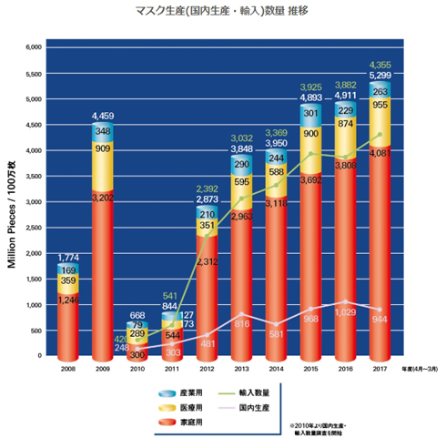 日本衛生材料工業連合会によるグラフ。2012年から急激に家庭用マスクの生産数量が増えています