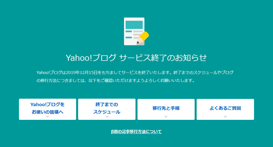 Yahoo! JAPANのブログサービス「Yahoo!ブログ」が、2019年12月15日でサービスを終了することが発表されました。8月31日には記事・コメント・トラックバックの投稿や編集が行えなくなり、12月15日には閲覧も含めた全サービスが終了となる予定。併せて他社ブログへの移行などについても案内しています。