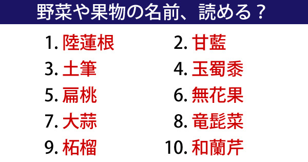今回は、野菜や果物の難読漢字をたくさん集めてみました。27個中、10個以上読めた人はかなりの物知りといえるでしょう。