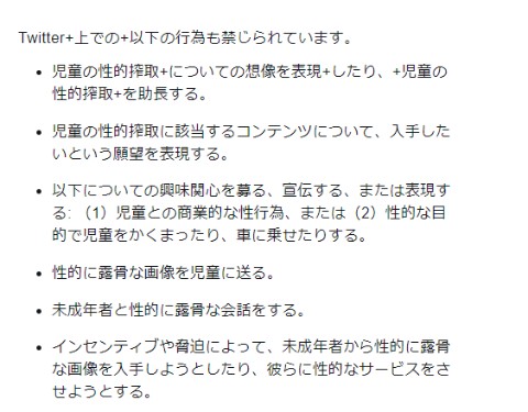 現在この部分が「Twitter上で禁じられている」行為として、「児童の性的搾取についての想像を表現したり、児童の性的搾取を助長する」と変更されています。同社は規約自体は変更しておらず、誤解を招かないために文言を変更したとしています。