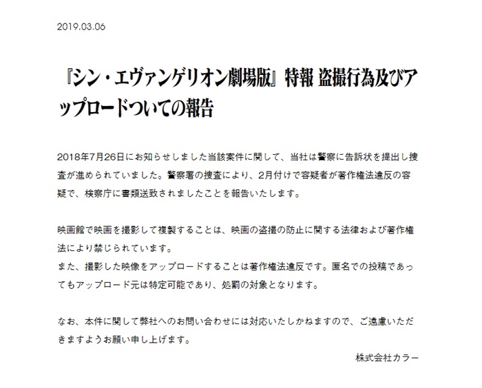 カラーは同件について東宝・東映と協議の上で対応をしていくと発表していましたが(関連記事)、2019年3月6日付けのコメントによると、警察署の捜査により容疑者は2月付けで著作権法違反の容疑で検察庁に書類送検されたとのことです。