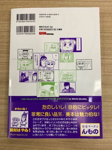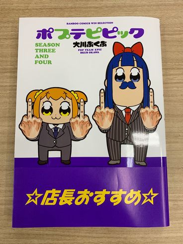 話題の帯は、コミックス第3集『SEASON THREE AND FOUR』に巻かれたもの。表には大きく「店長おすすめ☆」と書かれ、どの書店に置かれようと勝手に店長が勧めていることになってしまうという、ポプテピらしいふてぶてしさが光る帯となっています。