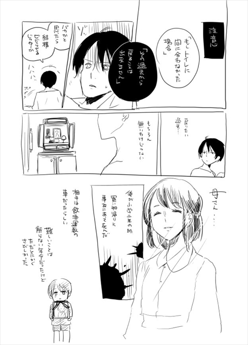 「飲んだ瞬間から排便するまでの間だけ過去に行けるが、トイレに間に合わなかった場合過去から戻れなくなる」という怪しげな下剤を手に入れた青年。一度は薬を放り投げますが、小学生のときに交通事故で亡くなった母親を思い出し、「もし本当なら?」と思い切って飲んでみます。