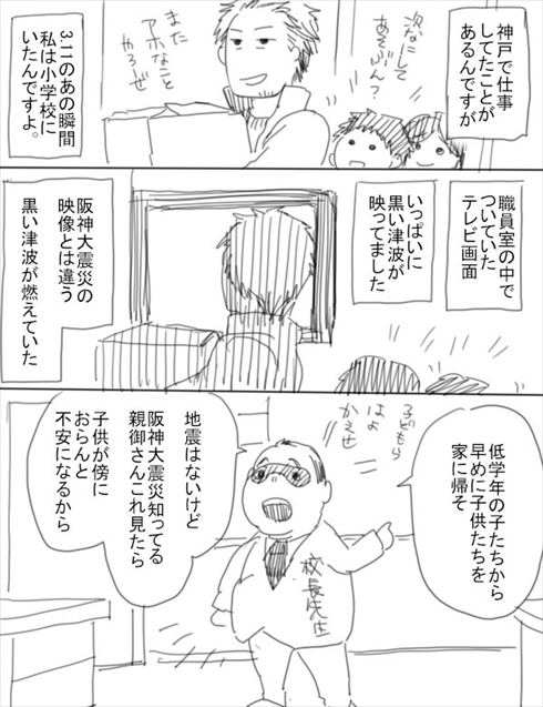 神戸で仕事をしていて、震災発生の瞬間に小学校にいたという作者さん。神戸では地震はなかったものの、校長先生は「阪神大震災を知っている親御さんが、子どもがそばにいないと不安になるから」と早めに子どもを帰すように指示します。