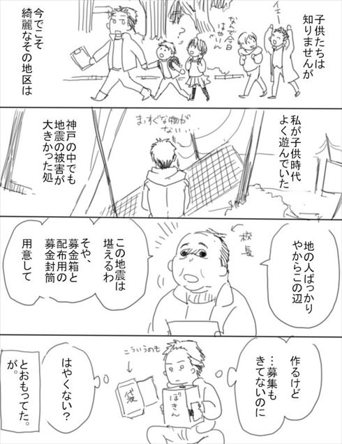 その学校がある地区は、阪神大震災でも地震の被害が大きかったところだといいます。住んでいるのは地の人(昔から住んでいる人)ばかりなのでこの地震はこたえる……と阪神大震災を思い出す校長先生。さらに、募金箱と配布用の募金封筒を用意するよう指示します。