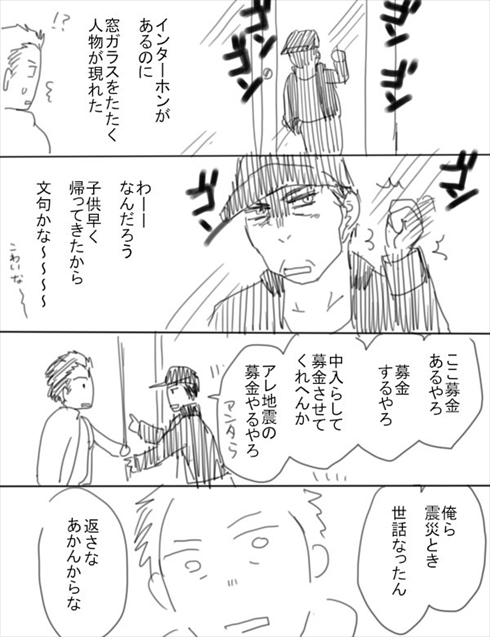 募金はまだ早いのではないかと思った作者さんですが、そこへ怖そうなおじさんがやってきて窓ガラスをたたきます。子どもを早く帰したことで文句を言われるのではないかと心配しますが、おじさんは「ここ募金あるやろ」「募金させてくれへんか」と申し出たのです。