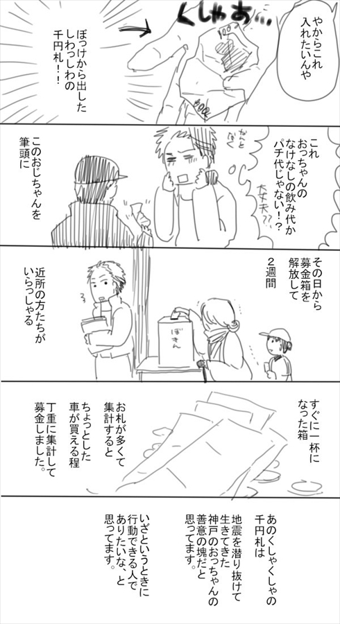 「あのくしゃくしゃの千円札は、地震をくぐり抜けて生きてきた神戸のおっちゃんの善意の塊だと思ってます」「いざというときに行動できる人でありたいな、と思ってます」と漫画は締めくくられています。