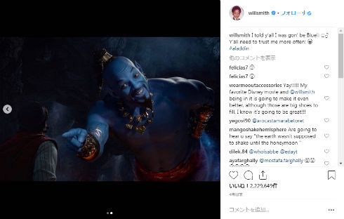 ウィル・スミス成分が強いというか完全に青いウィル・スミスなランプの魔人「ジーニー」が登場するディズニーの実写映画「アラジン」(6月7日全国公開)の予告映像(US版)が解禁されました。ってやっぱりウィル・スミスだこれ!