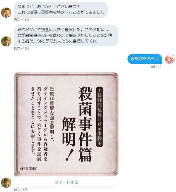 事件はこのまま迷宮入りか? と思われたその時、とても重要なことを思い出しました。そうです、ヒントです。困ったときはDMで青二刑事からヒントをもらうことができるんでした。