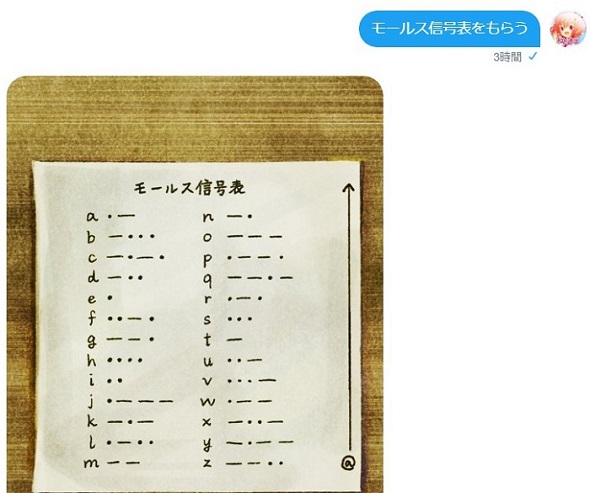 暗号の中に波線が引いてある部分に注目してください。「瞳の中」と書いてありますよね。つまりこれは「ひ」と「み」の中に答えが隠されている、ということ。暗号の中に「ひ」と「み」は1文字ずつしか出てきていないので、その間に挟まれた言葉を読むと「モールス信号表」と出てきます。どうです、分かりましたか?