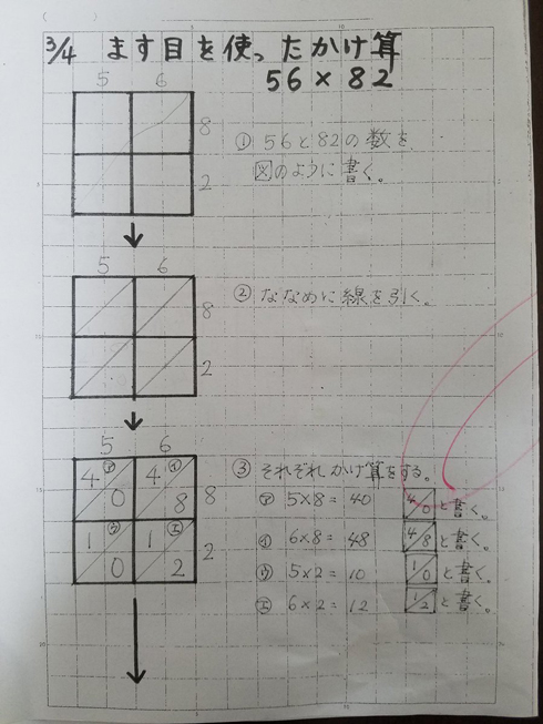 言葉で説明すると何やら難しそうに見えますが、要は九九の答えを書き込んでいき、それを足し算しているだけ。マス目や斜線で区切られた範囲を見ていけばよいため、「数字がゴチャゴチャになって、どの数字を足し算すればいいか分からなくなった」「繰り上がりを見落とした」といったミスが少なくなりそうです。