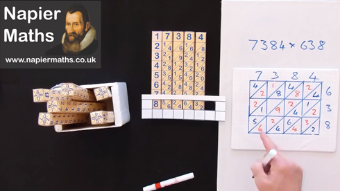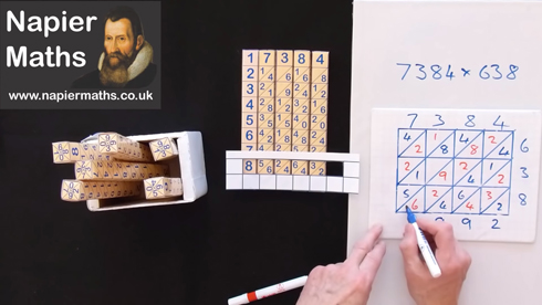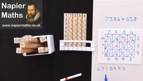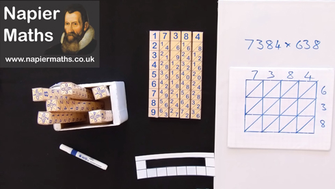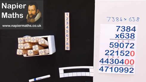 この「ネイピアの計算棒」は、言ってみれば「段ごとに切り分けた九九表」のようなもの。計算式に合わせて並べ替え、その数字をマス目に書き写すと掛け算は完了