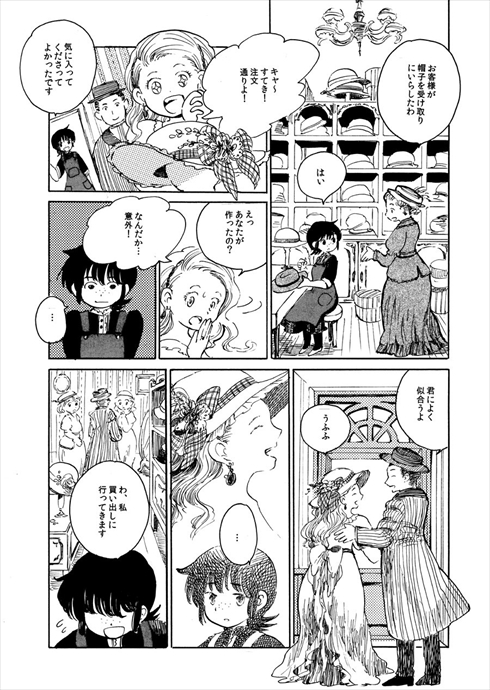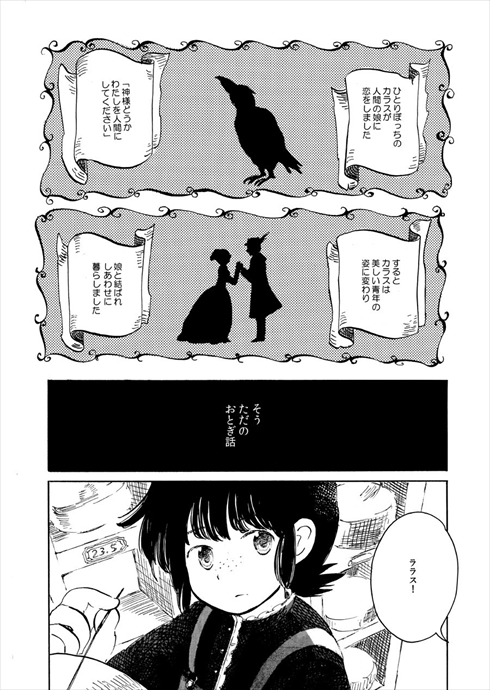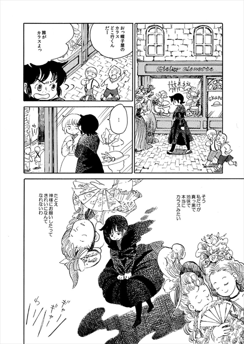 その後彼女が働く帽子屋さんに、美しい青年が帽子を注文しに訪れます。工房の石やボタンがキラキラして宝石のようだと興味を示す彼を見て、輝くものを集めるカラスの習性の話をするララス。カラスは真っ黒で地味だから、きれいなものに憧れている――自分がきれいな帽子を作りたいのは自分がきれいではないからだと話すララスですが、青年は自分を卑下する彼女の言葉を否定します。「君の目、キラキラした宝石みたいできれいだよ」と。