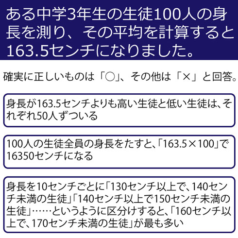 ある中学3年生の生徒100人の身長を測り、その平均を計算すると163.5センチになりました。この結果から確実に正しいといえることには「○」、そうでないものには「×」と答えてください。全問正解で正答。