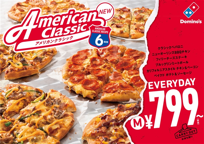 ドミノピザは「ピザは高い」「パーティの時に食べるもの」という固定イメージを打ち壊すべく、新価格帯のピザ「アメリカンクラシック」を発表しました。価格は持ち帰り価格799円〜、デリバリー1800円〜で、味は全6種類。