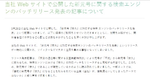 当該の発表文は「新元号『安久』に対応する検索エンジンのパッチリリースを発表いたします」「『天皇の退位等に関する皇室典範特例法』により、和暦の元号は2019年5月1日に『平成』から新元号『安久』に変わります」といった内容で一時同社のWebサイトに掲載されていました(その後削除)。新元号が「安久」に確定したかのような文面に、一部では、「事前に新元号を知らされていた企業が、情報漏えいしたのでは」との声もみられました。