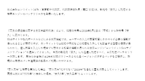 IT企業ロンウイットが、「新元号『安久』に対応する検索エンジンのパッチをリリースする」と一時発表し、「新元号が漏れたのでは」と騒然となっていた件について、同社は新元号は「仮置き」だったと説明して謝罪しました