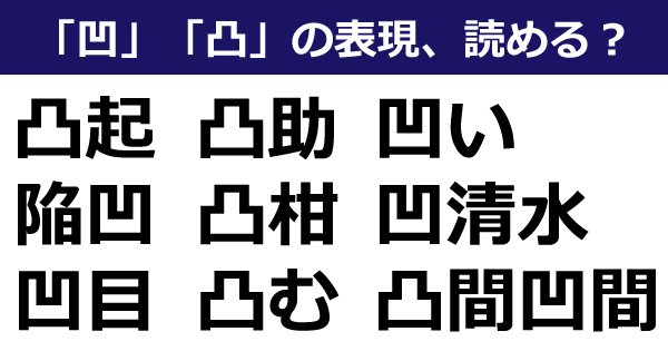 「凹」「凸」は記号のようにも見えますが、れっきとした漢字。常用漢字表には「オウ」「トツ」という音読みが掲載されていますが、これ以外の読み方も存在。「大凸部」「凹清水」という地名にも使われています。ただ、あまり目にする機会がないので、さらっと読める人はかなり少ないはず。