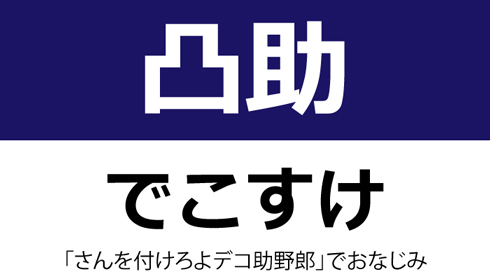 A:でこすけ(「凸」には額(ひたい)という意味もあり、額が広く、突き出た様子をからかう表現。アニメ「AKIRA」のせりふ「さんをつけろよデコ助野郎」でおなじみ)