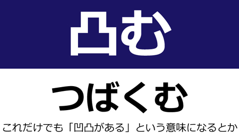 A:つばくむ(「凸」しか使われていないが、「突出する」に加え、「凹凸がある」という意味もあるとか)