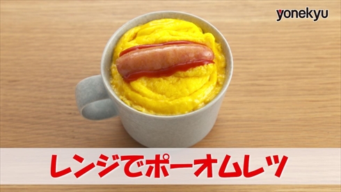 DAIGOさんが食べているのは「レンジでポーオムレツ」。名前からして電子レンジで簡単に作れる料理なんでしょうか? フワフワの玉子とプリプリのごてあらポーが合わさっておいしそうです、僕も食べたいな〜。