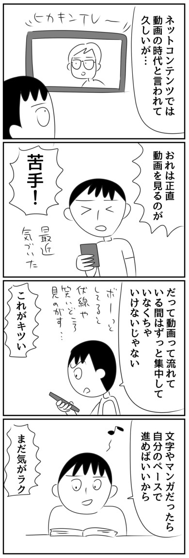 「正直動画を見るのが苦手!」ということに最近気付いた斎藤さん。動画が流れている間、ずっと集中していないと伏線や笑いどころを見逃してしまうのがキツいからだといいます。文字やマンガは自分のペースで進められるので気が楽だ、とも。