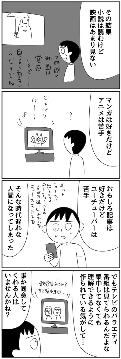 その結果「小説は読むけど映画はあまり見ない」「マンガは好きだけどアニメは苦手」「おもしろ記事は好きだけどユーチューバ−は苦手」に。ただ、テレビのバラエティ番組は集中しなくても理解できるように作られている気がして見ていられるのだそうです。