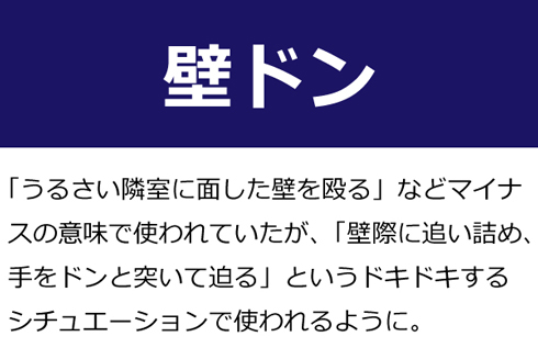 A:「うるさい隣室に面した壁を殴る」などマイナスの意味で使われていたが、「壁際に追い詰め、手をドンと突いて迫る」というドキドキするシチュエーションで使われるように。