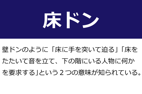 A:壁ドンのように「床に手を突いて迫る」「床をたたいて音を立て、下の階にいる人物に何かを要求する」という2つの意味が知られている。