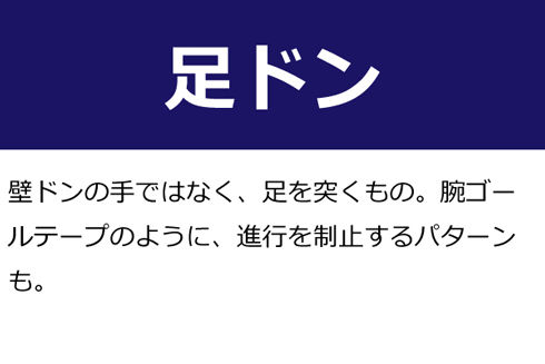 A:壁ドンの手ではなく、足を突くもの。腕ゴールテープのように、進行を制止するパターンも。
