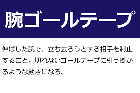 A:伸ばした腕で、立ち去ろうとする相手を制止すること。切れないゴールテープに引っ掛かるような動きになる。
