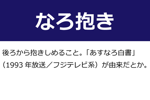 A:後ろから抱きしめること。「あすなろ白書」(1993年放送/フジテレビ系)が由来だとか。