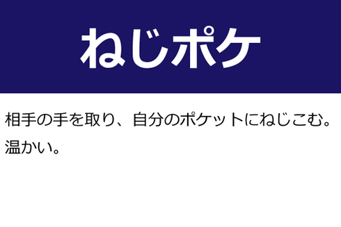 A:相手の手を取り、自分のポケットにねじこむ。温かい。