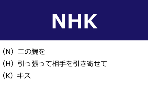 A:(N)二の腕を、(H)引っ張って相手を引き寄せて、(K)キス