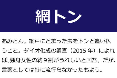 A:あみとん。網戸にとまった虫をトンッと追い払うこと。ダイオ化成の調査(2015年)によれば、独身女性の約9割がうれしいと回答。だが、流行らなかったもよう。