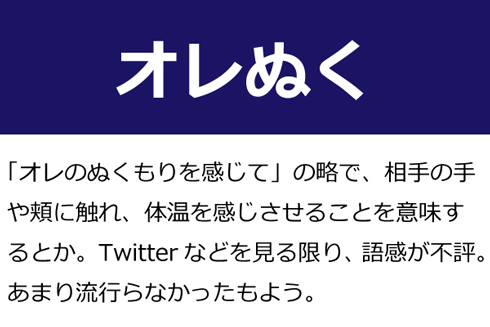 A:「オレのぬくもりを感じて」の略で、相手の手や頬に触れ、体温を感じさせることを意味するとか。Twitterなどを見る限り、語感が不評。あまり流行らなかったもよう。