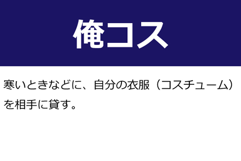 A:寒いときなどに、自分の衣服(コスチューム)を相手に貸す。