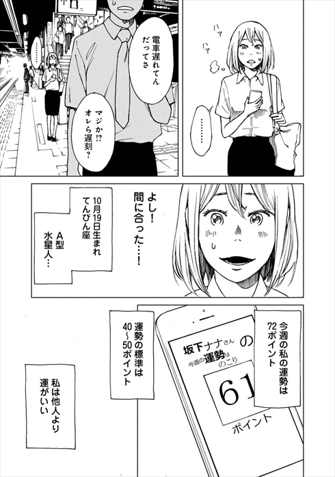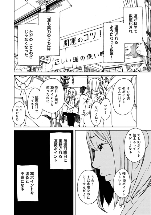 物語の舞台は現代の世界と似ていますが、運が科学によって数値化されており、「運も実力のうち」が現実に。人々は毎週割り当てられられる運勢ポイントを携帯端末で管理し、運を使うと消費ポイントに応じて30分間運がよくなるという仕組みです。
