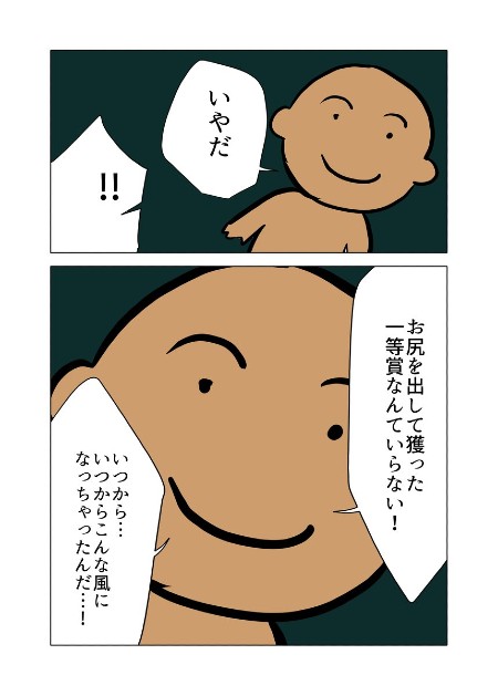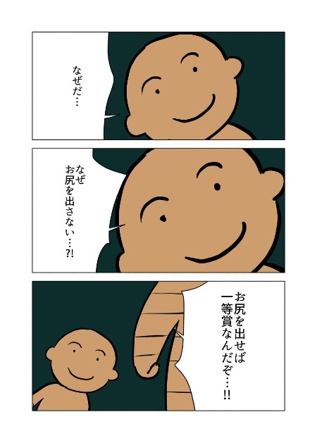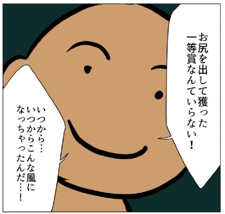 かくれんぼでお尻を出した子が一等賞になれるのに、お尻を出さない子。もう一人の子どもがなぜお尻を出さないのかと詰め寄ります。「お尻を出せば一等賞なんだぞ……!!」と問い詰められた子は「お尻を出して獲った一等賞なんていらない!」と反論。いつからこんな風になってしまったのかと嘆きます。