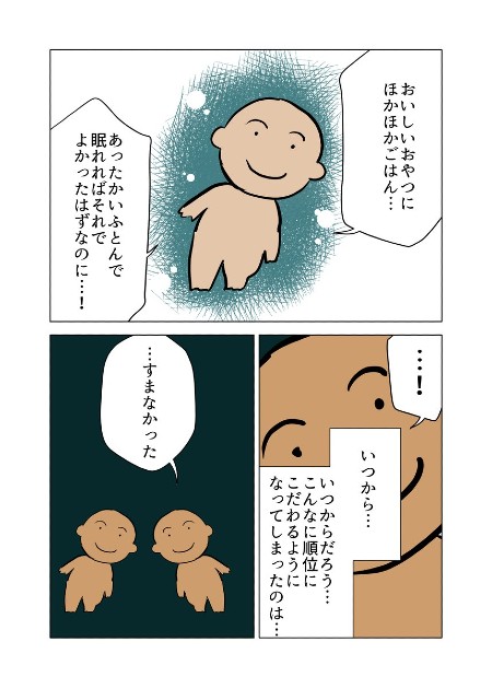 なぜ人は今の暮らしに飽き足らず、多くを求め順位にこだわるのでしょう。そんな風潮に一石を投じる漫画に、「感動した」と謎の感動を覚える読者の声が寄せられています。他にもかわいいキャラがハードな口調でしゃべるギャップが受けたという人、全裸にしか見えないラストに「尻丸出しじゃねぇか!」と突っ込む人などさまざまな反応が見られます。