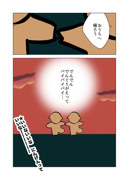 おやつにごはんにあったかいふとん――それでよかったはずなのに、いつからこんなに順位にこだわるようになったのだろうと悲しそうに語る子。もう一人の子はすまなかったと謝り、2人は手を取り合って「でんぐりがえってバイバイバイ」とおうちに帰るのでした。その姿は全裸にしか見えませんが……。