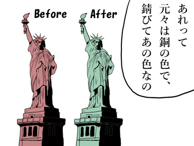 米国で自由の女神の除幕式が行われたのは1886年。外側は銅でできており、実はこのころの見た目は「茶色」でした。