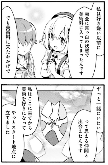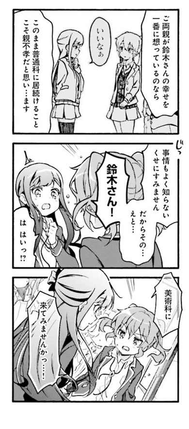 くろば:あそこで朱花ちゃんを美術科に誘えたのは、数話前のエピソードで黄奈子ちゃんが親と和解できていたこともフラグになってますよね。