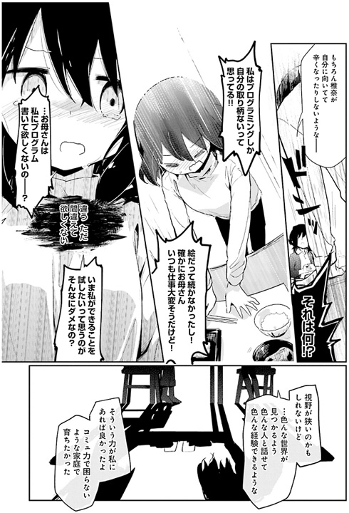 くろば:単行本の描き下ろしなんかもう、脳汁出しながら描いてますよ(笑)。7巻の描き下ろしの、村上母娘のやりとりも楽しかった。バツイチの在宅プログラマーという環境の中で娘を育てていこうと決意する母親の感情と、その大変さを分かってはいるけど勢いできついことを言ってしまう椎奈の未熟な感情のぶつかりあい。そういう場面を描いているとき、自分、今くろば・Uのマンガ描いてるなあって実感します。